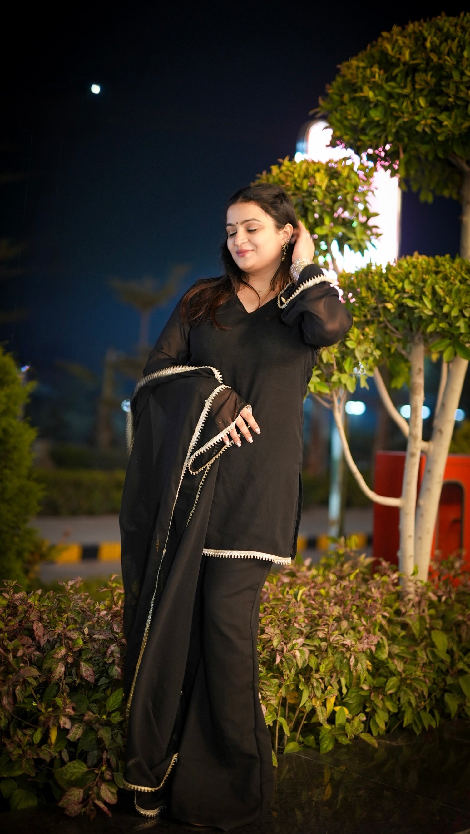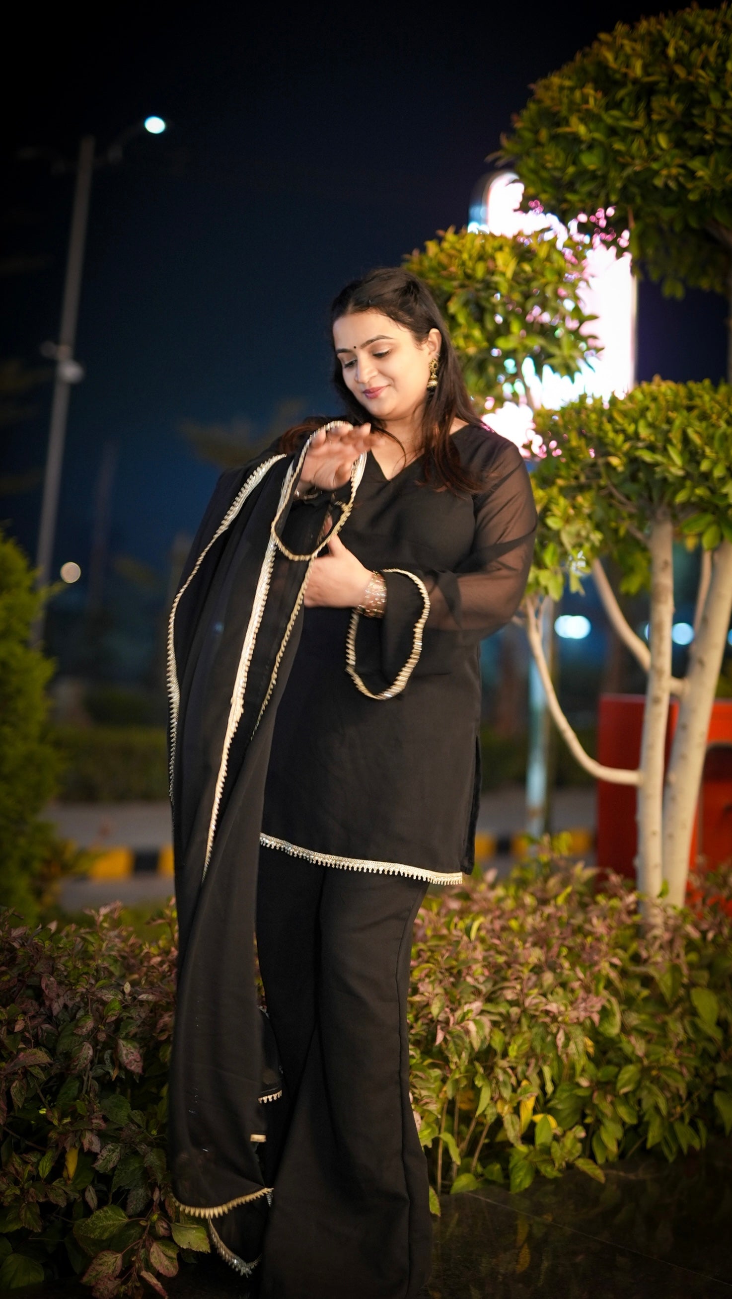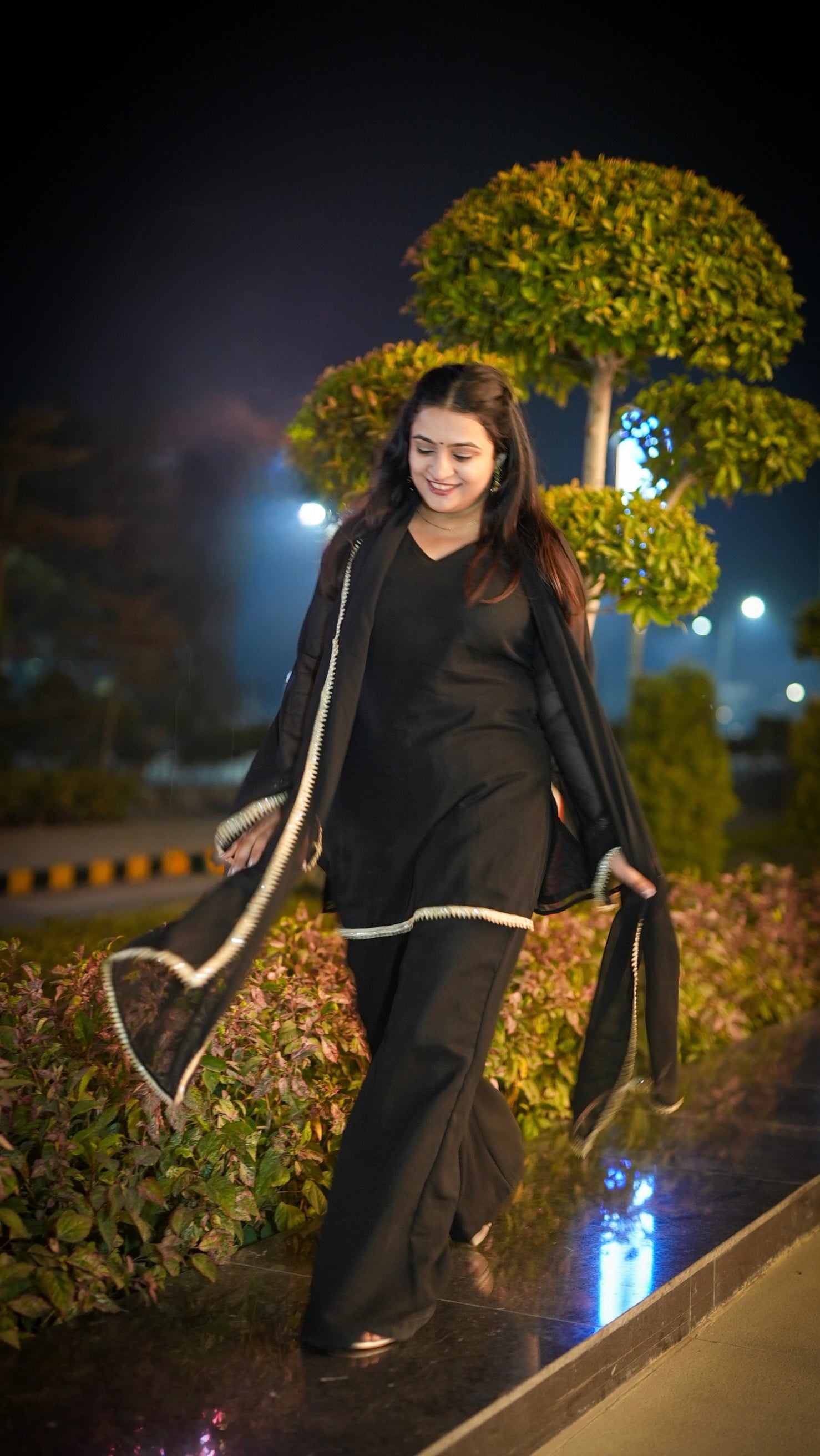 Styling Tip - Pair this all-black Poo-style suit with silver jhumkas, a sleek bracelet and kohl-rimmed eyes for that effortless glam. Keep hair softly open or half-tied to let the neckline shine. Works beautifully for night events, family dinners & festive outings.”