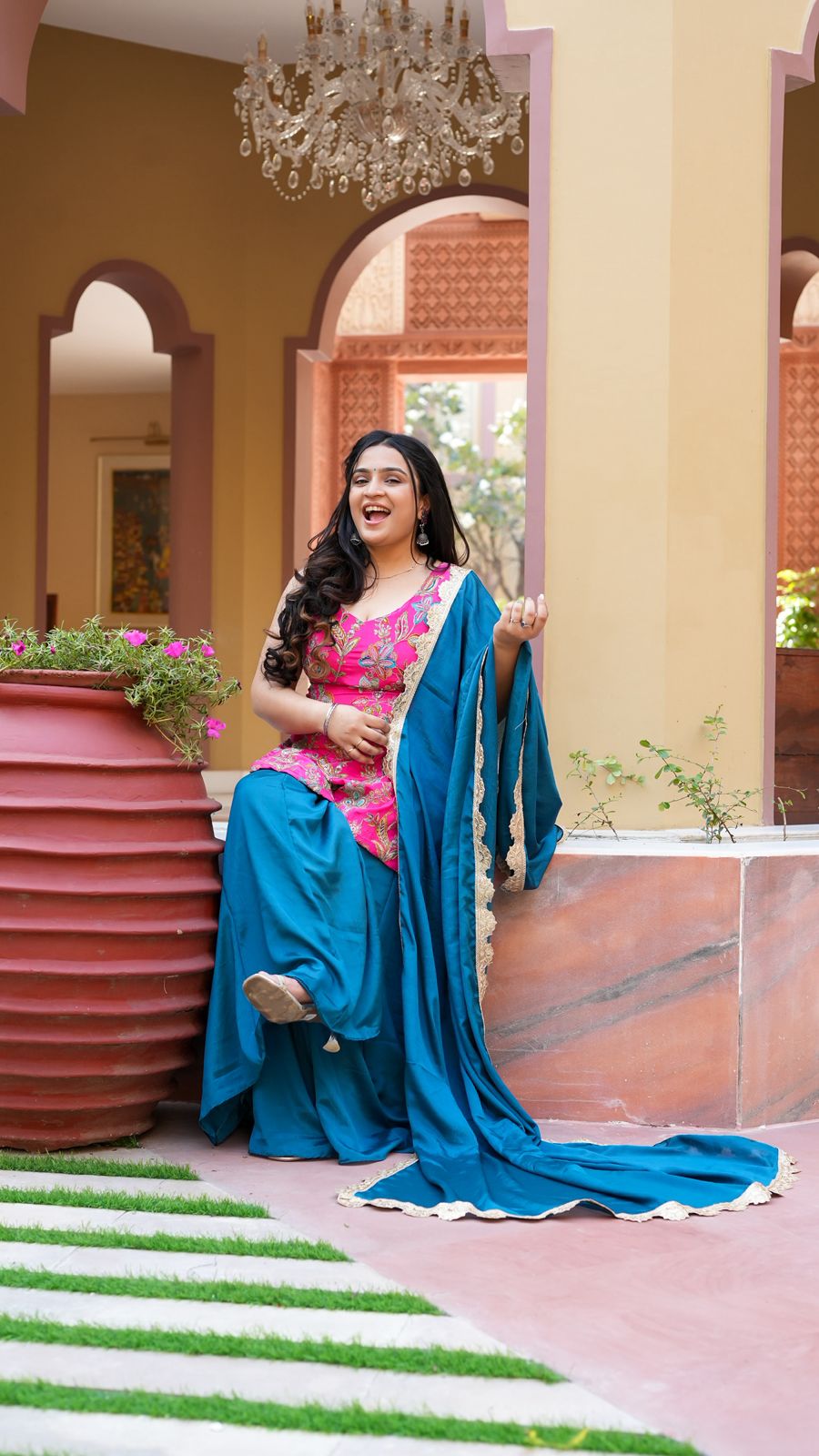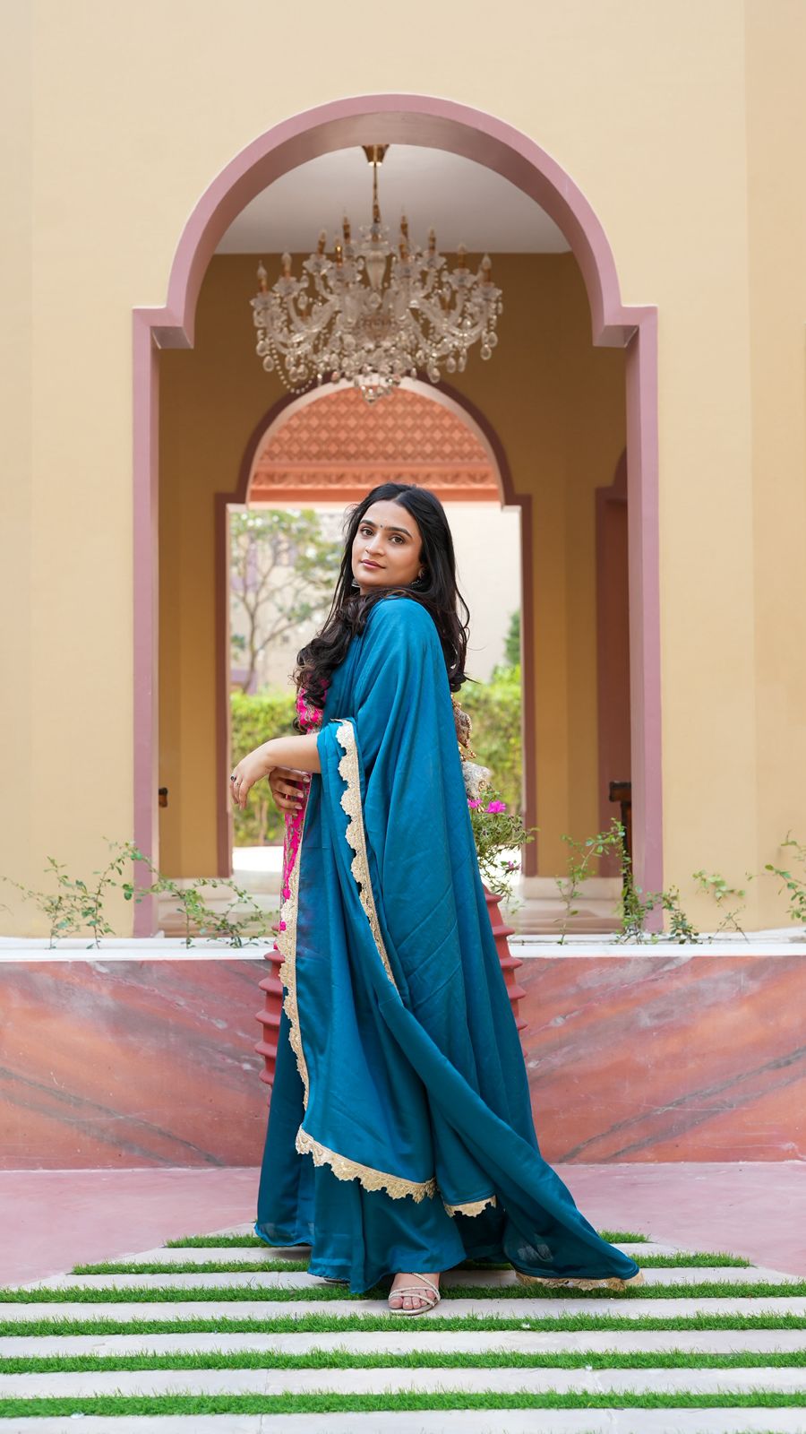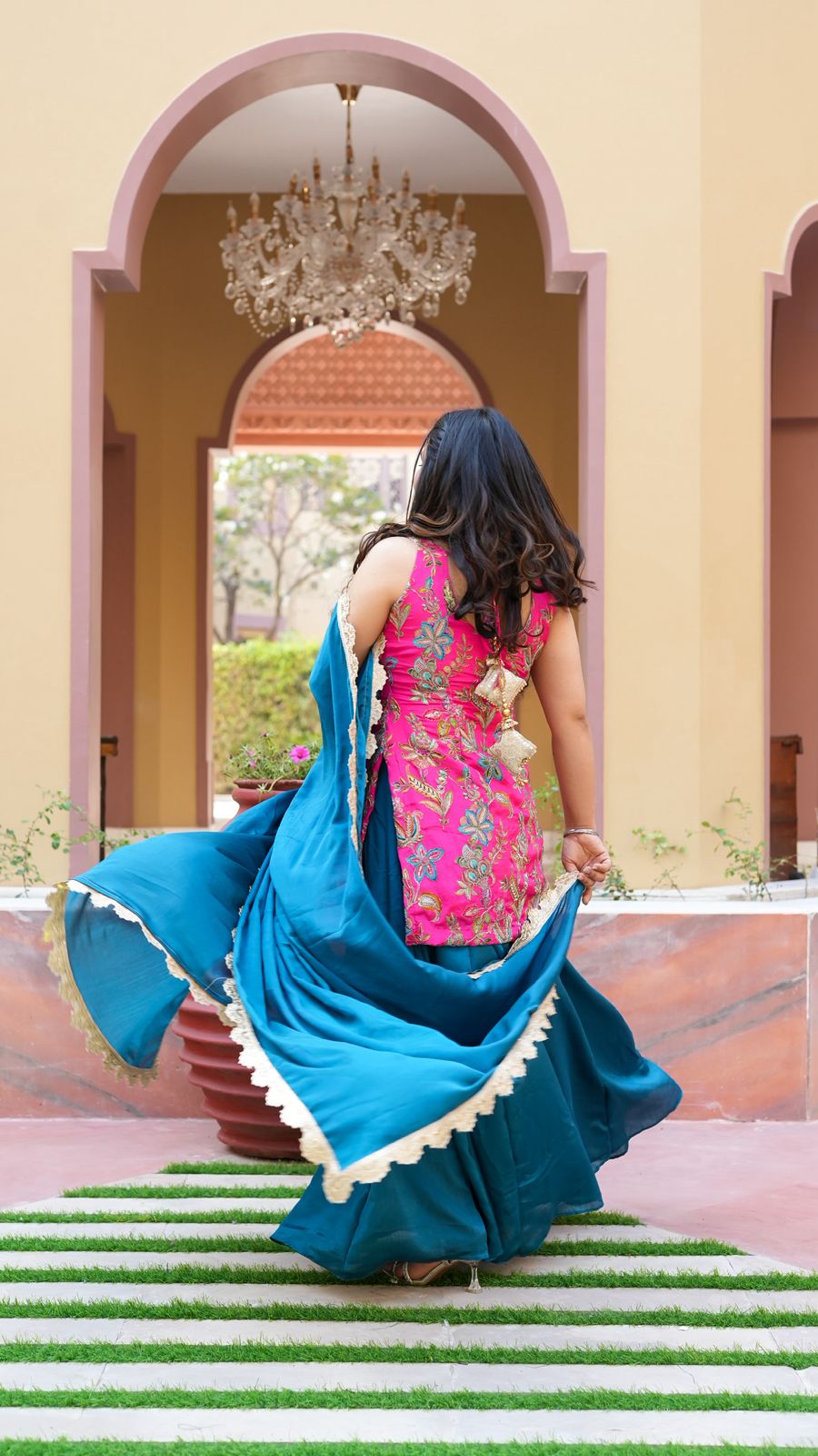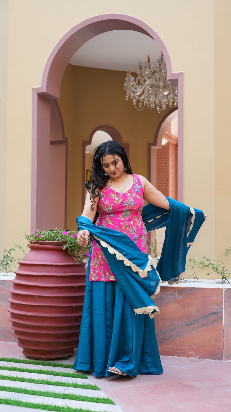 A striking fuchsia pink embroidered kurta paired with a deep teal drape — where tradition meets statement style. The intricate threadwork and scalloped lace detailing add a festive charm that’s effortlessly eye-catching.