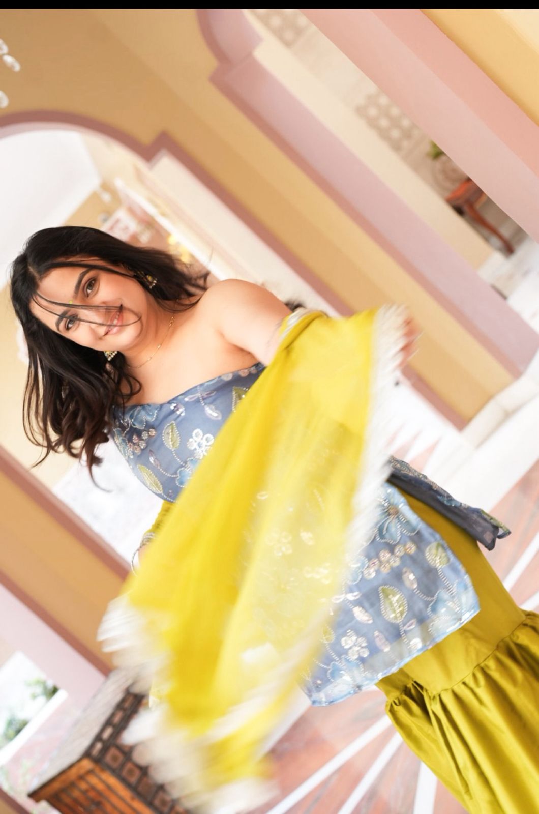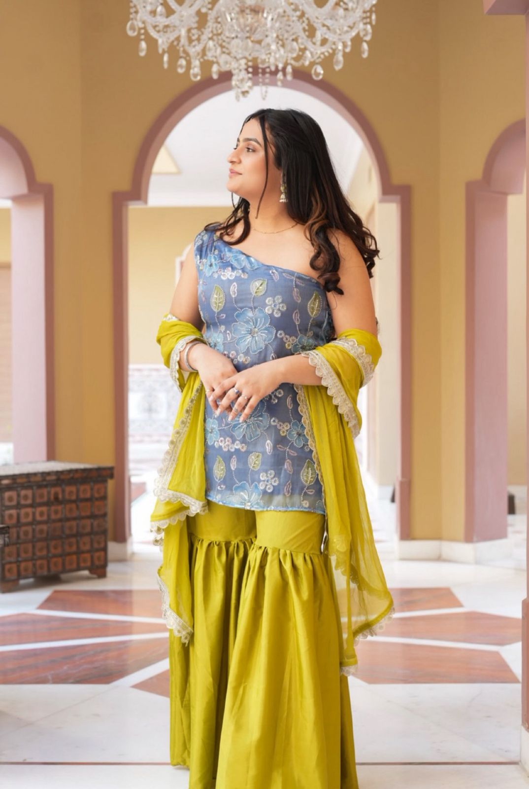 A vibrant blend of blue and lime green — featuring an asymmetrical embroidered top paired with flared bottoms and a soft dupatta trimmed in lace. Perfect for when you want to keep it modern yet traditionally rooted.